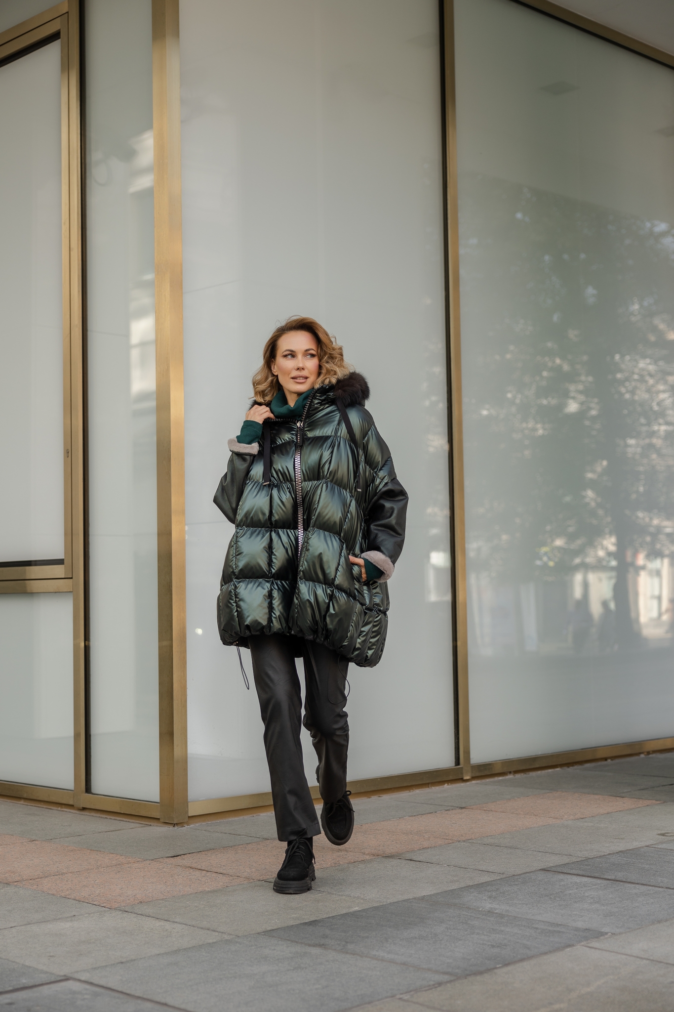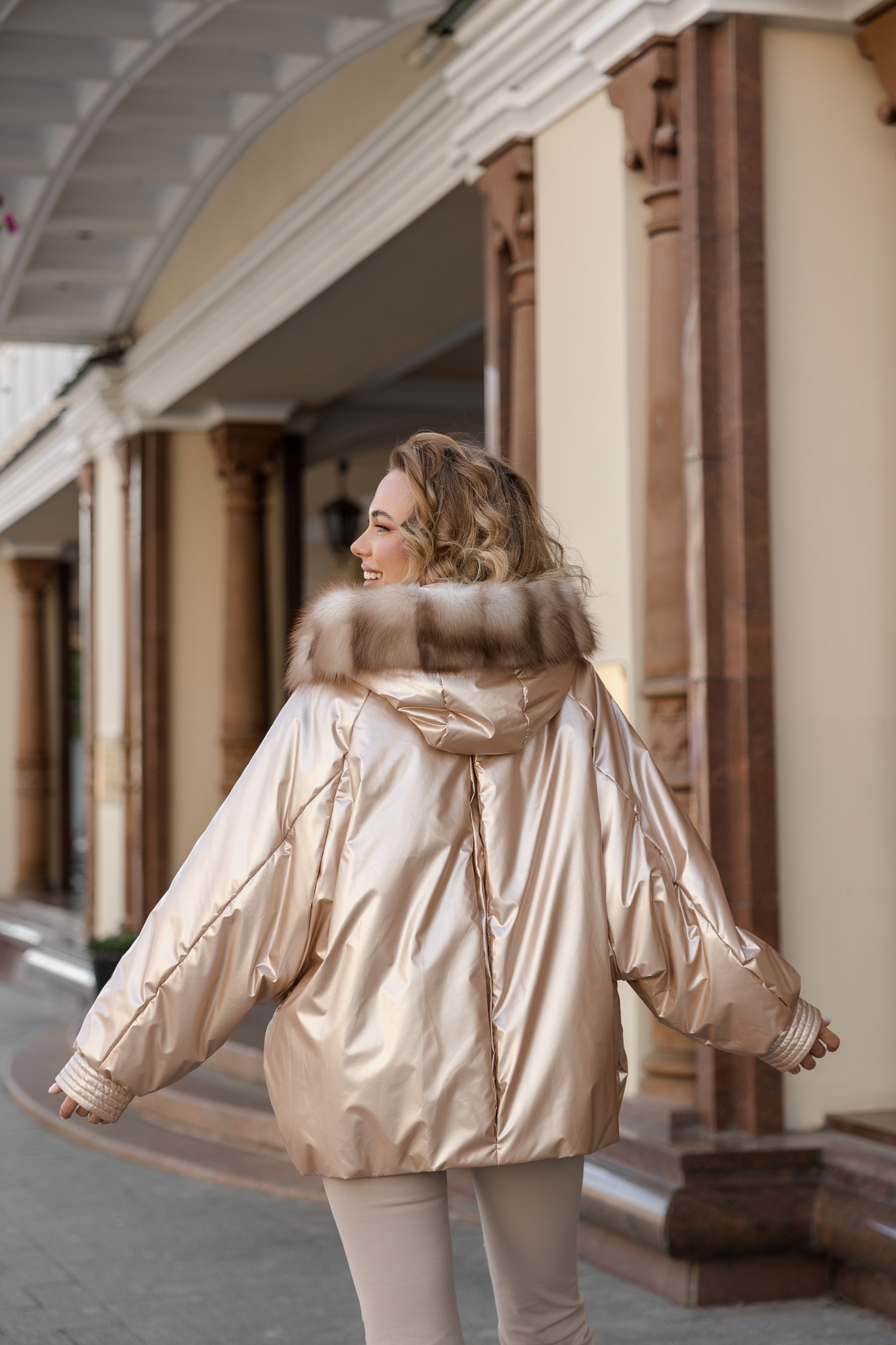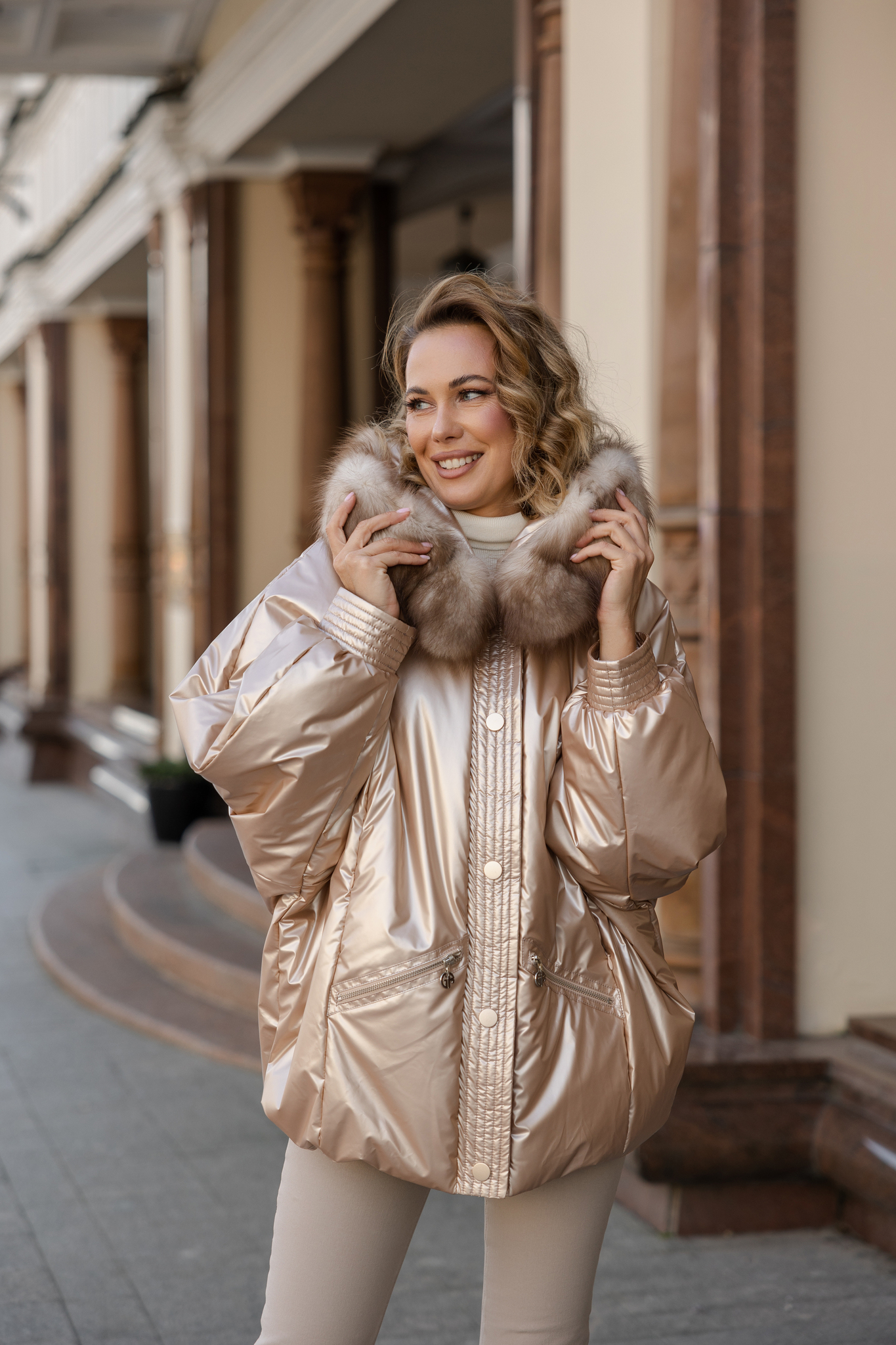Куртка средней длины с капюшоном декорированный мехом куницы. Рукава кроя летучей мыши