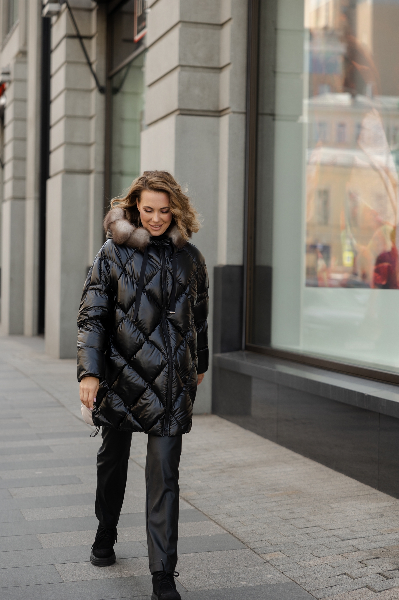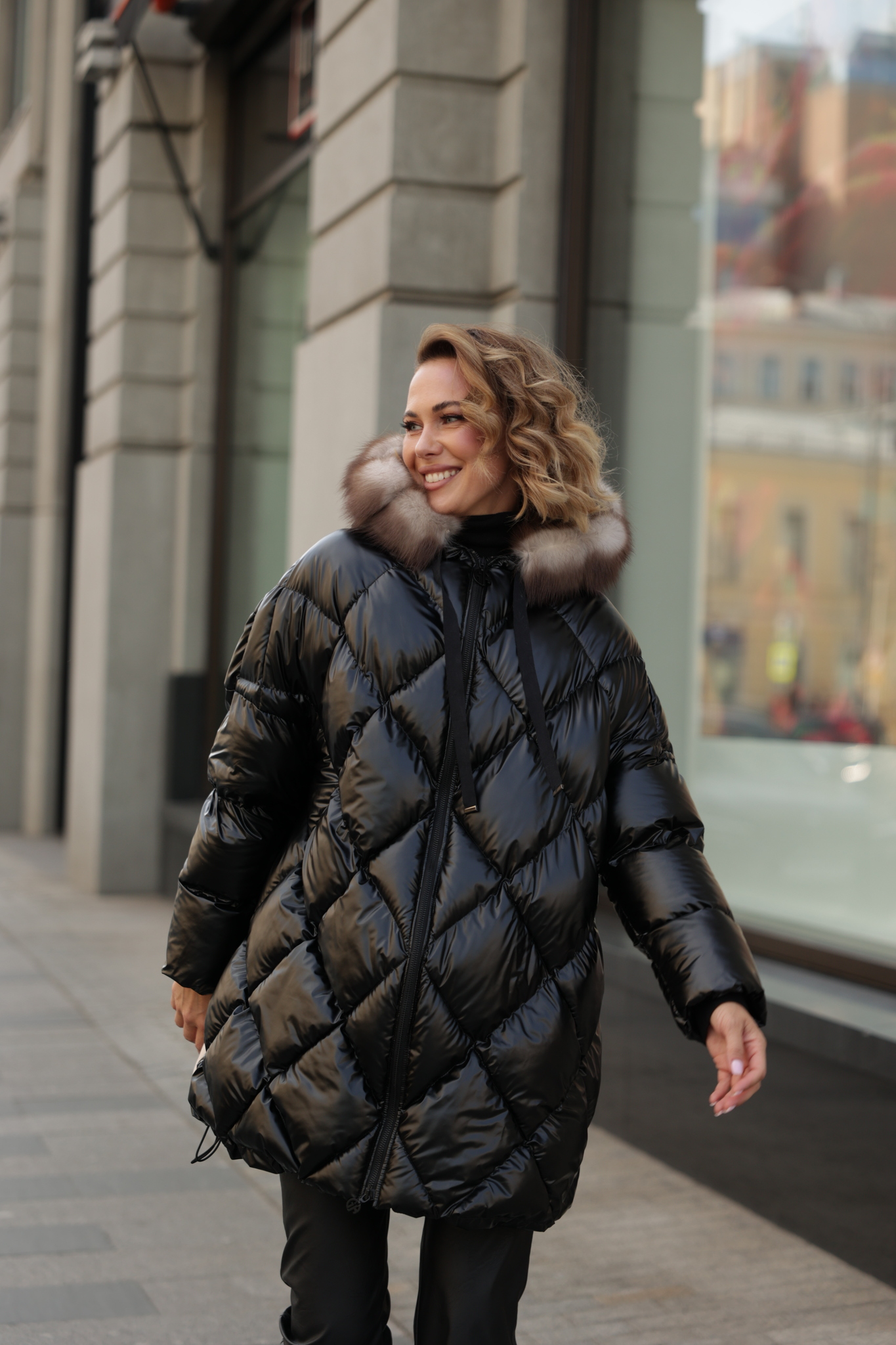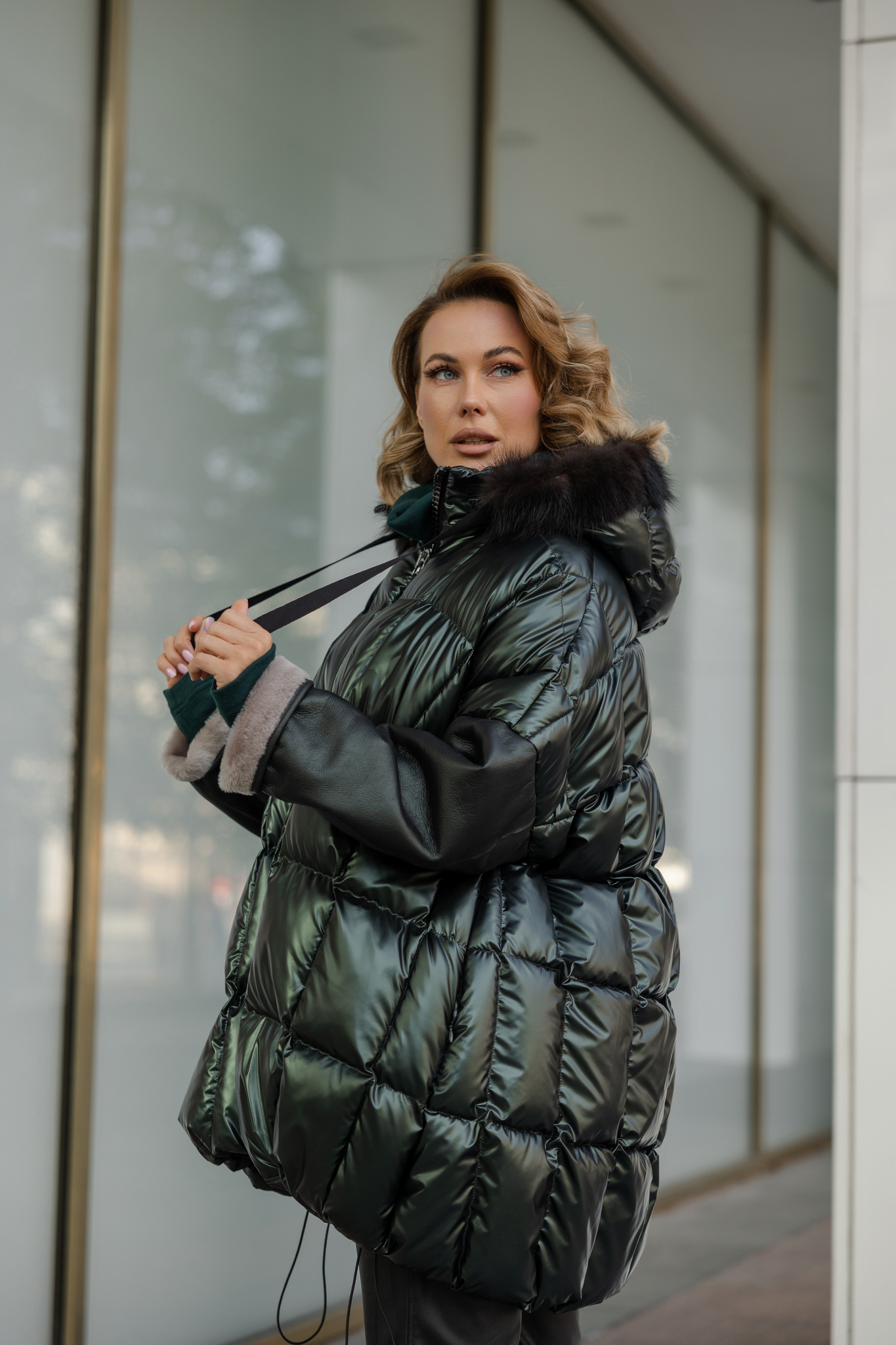 Куртка средней длины с капюшоном декорированный мехом куницы. Рукава кроя летучей мыши