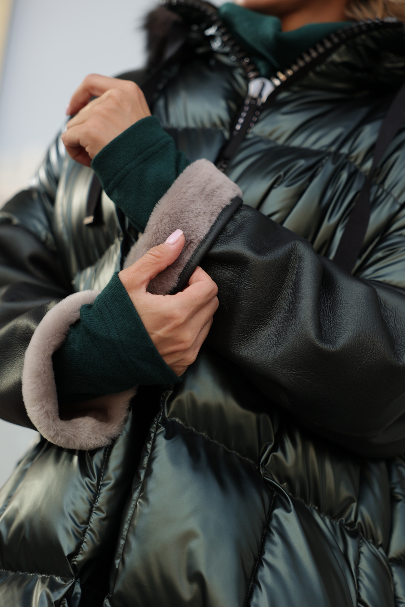 Куртка средней длины со съемным капюшоном. Рукава выполнены натуральной кожи с мехом внутри. Капюшон декорирован мехом