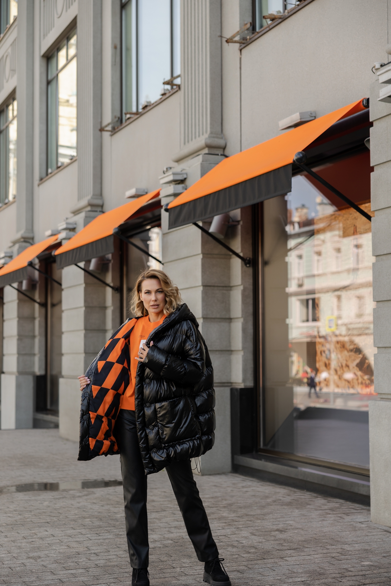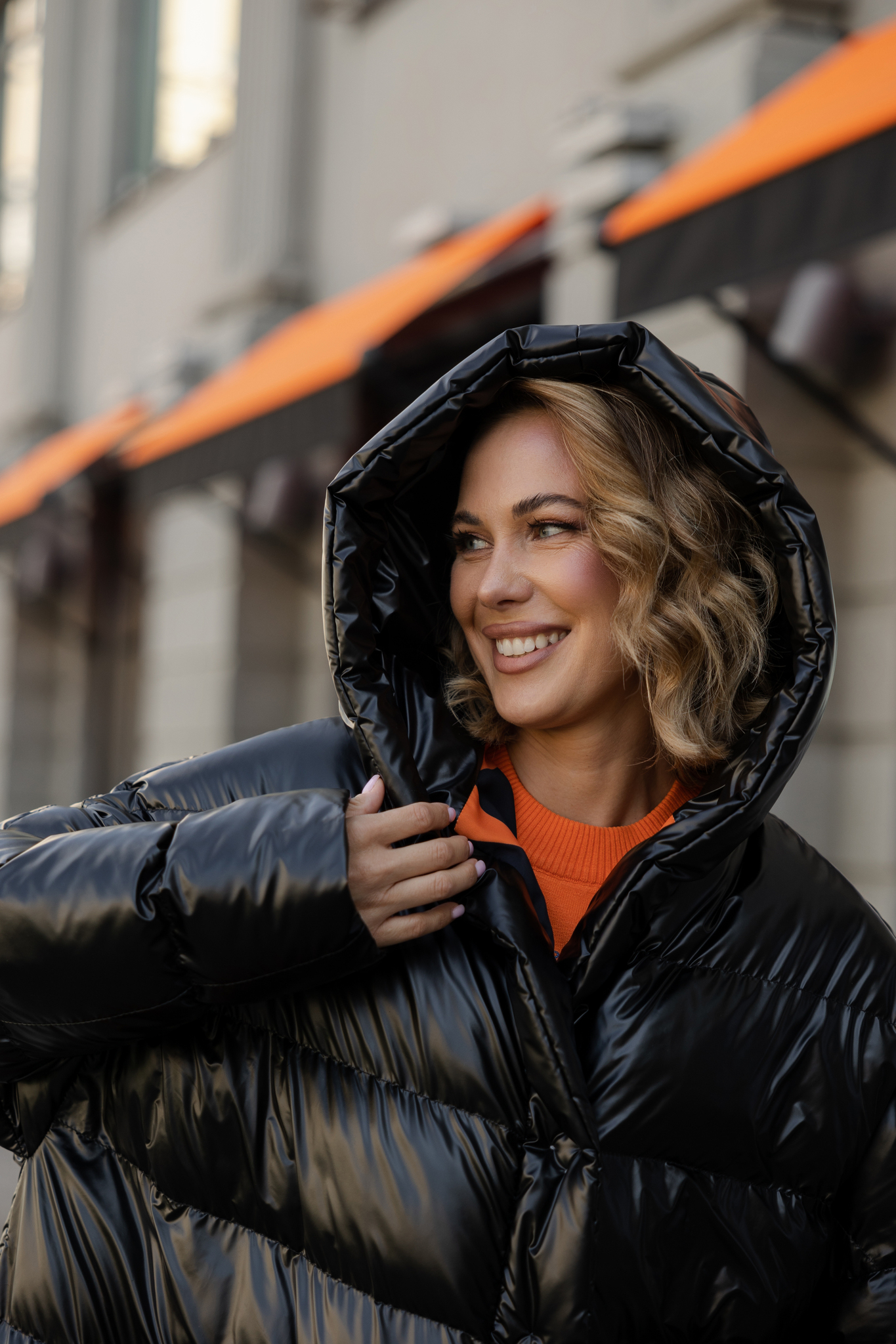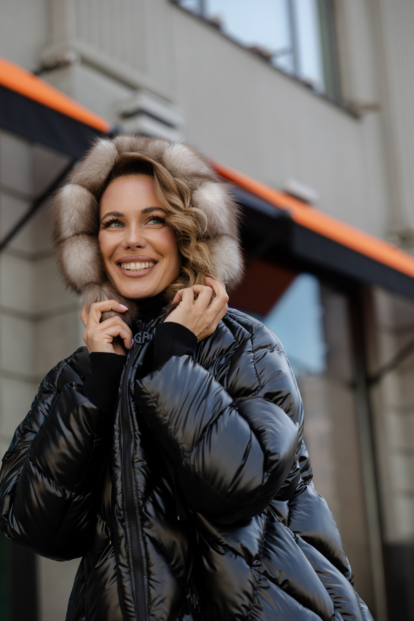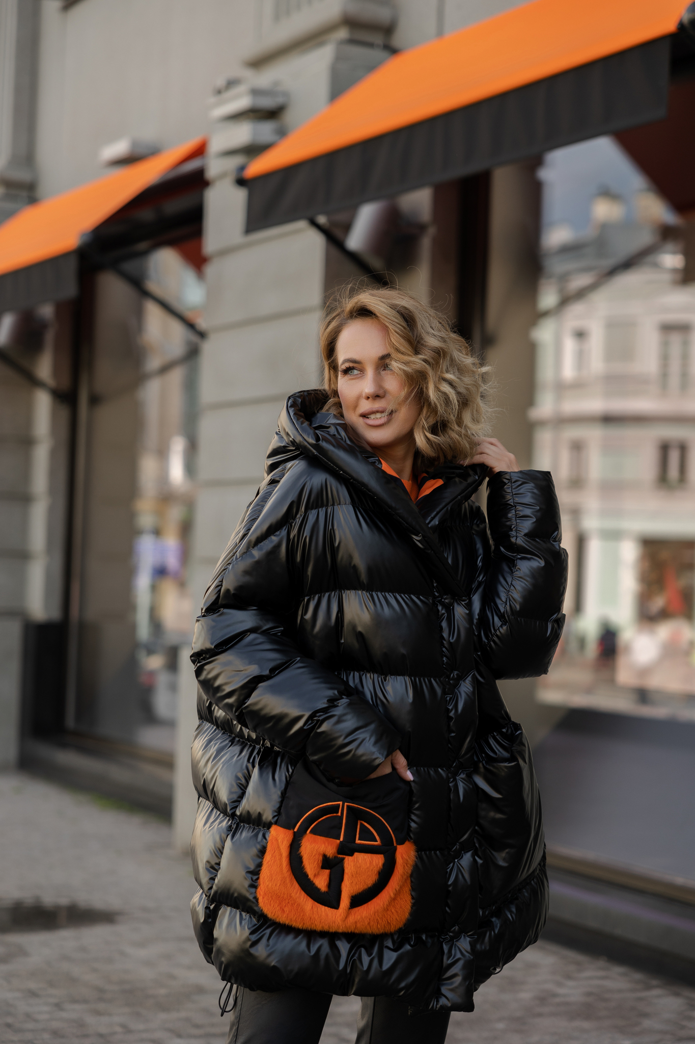 Куртка средней длины на плотных кнопках под пояс. Ворот плавно переходит в капюшон. Один накладной карман декорирован мехом норки выкрашен в яркий оранжевый цвет.