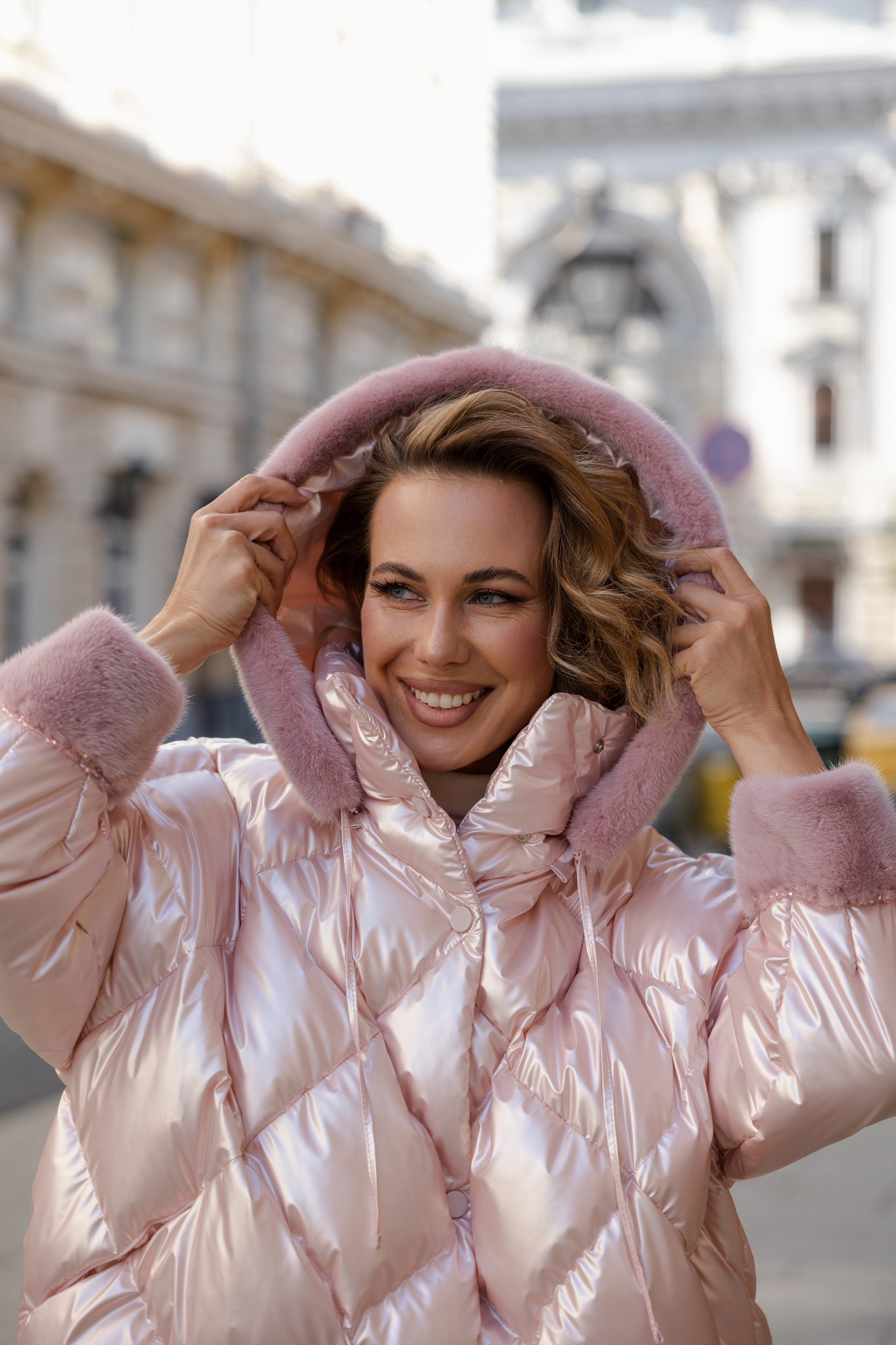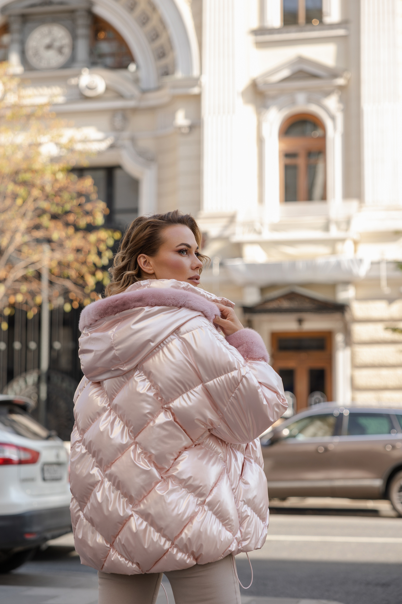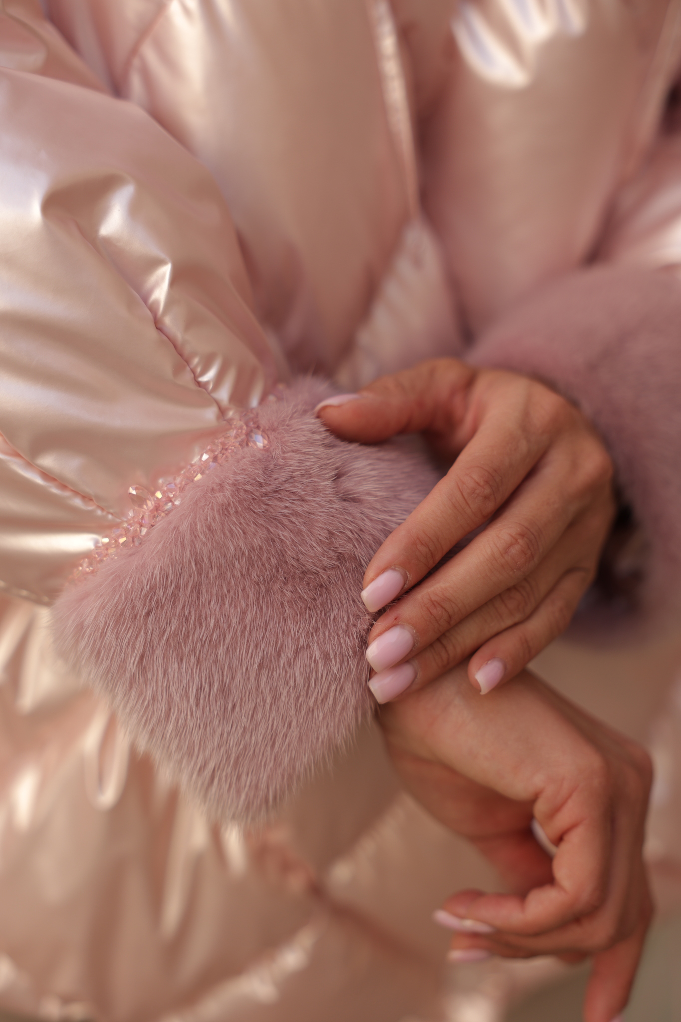 Куртка средней длины со съемным капюшоном. Манжеты и капюшон декорированы мехом из 100% натуральной норки в тон изделия