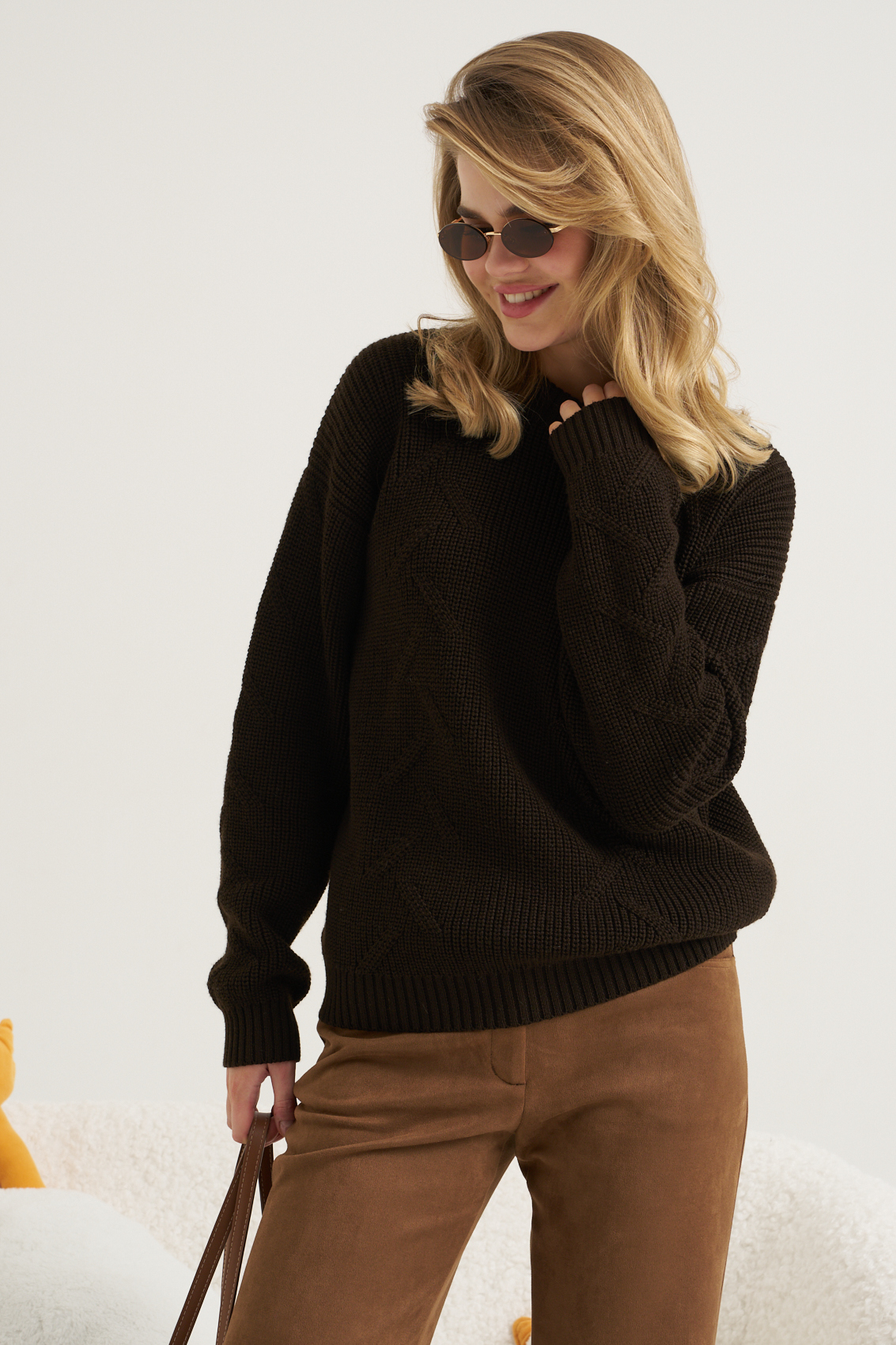 Джемпер женский удлиненный фактурной крупной вязки с воротником стойкой