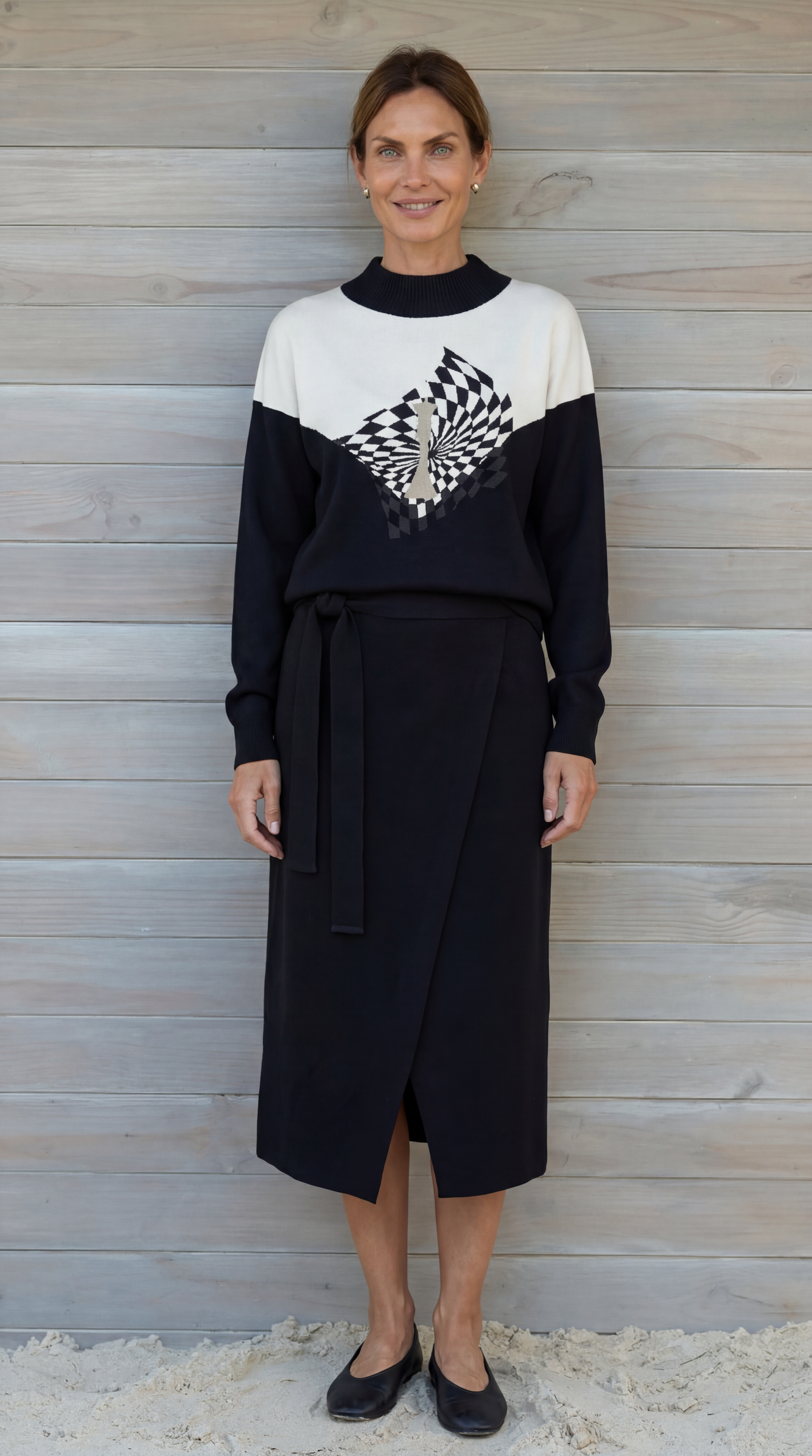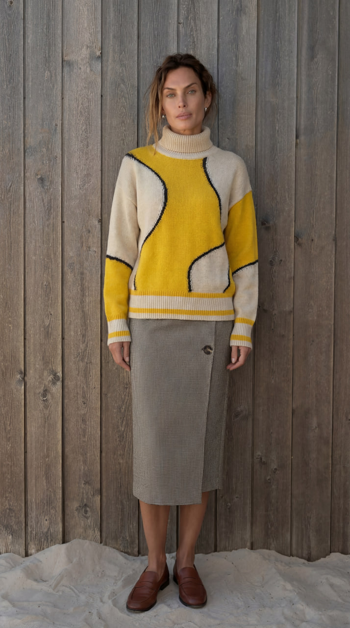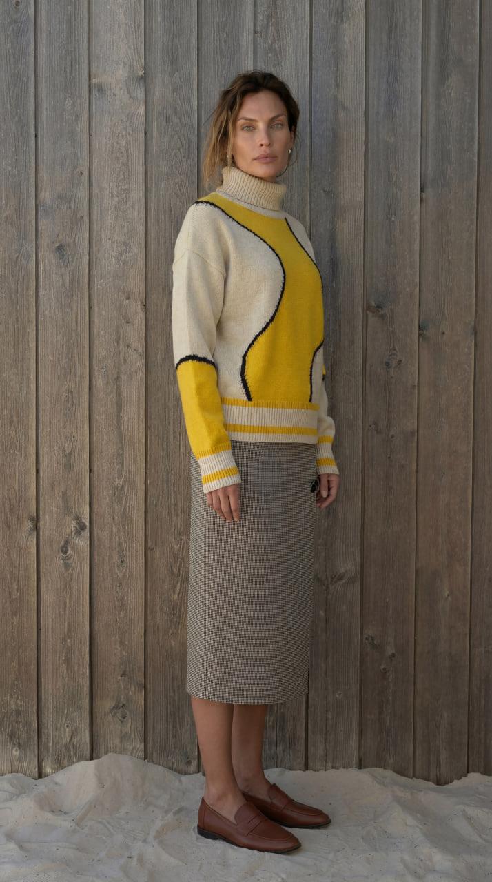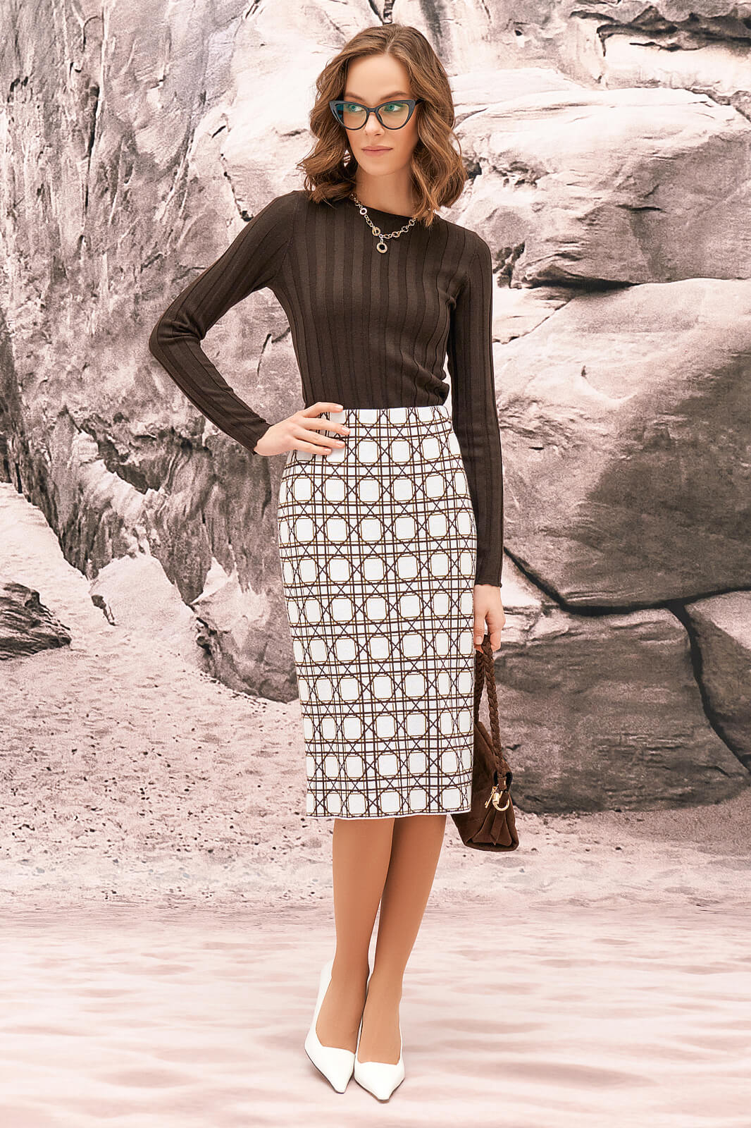 Юбка прямого кроя из плотного трикотажа с геометрическим принтом. Модель с подкладом и эластичной тесьмой на поясе.