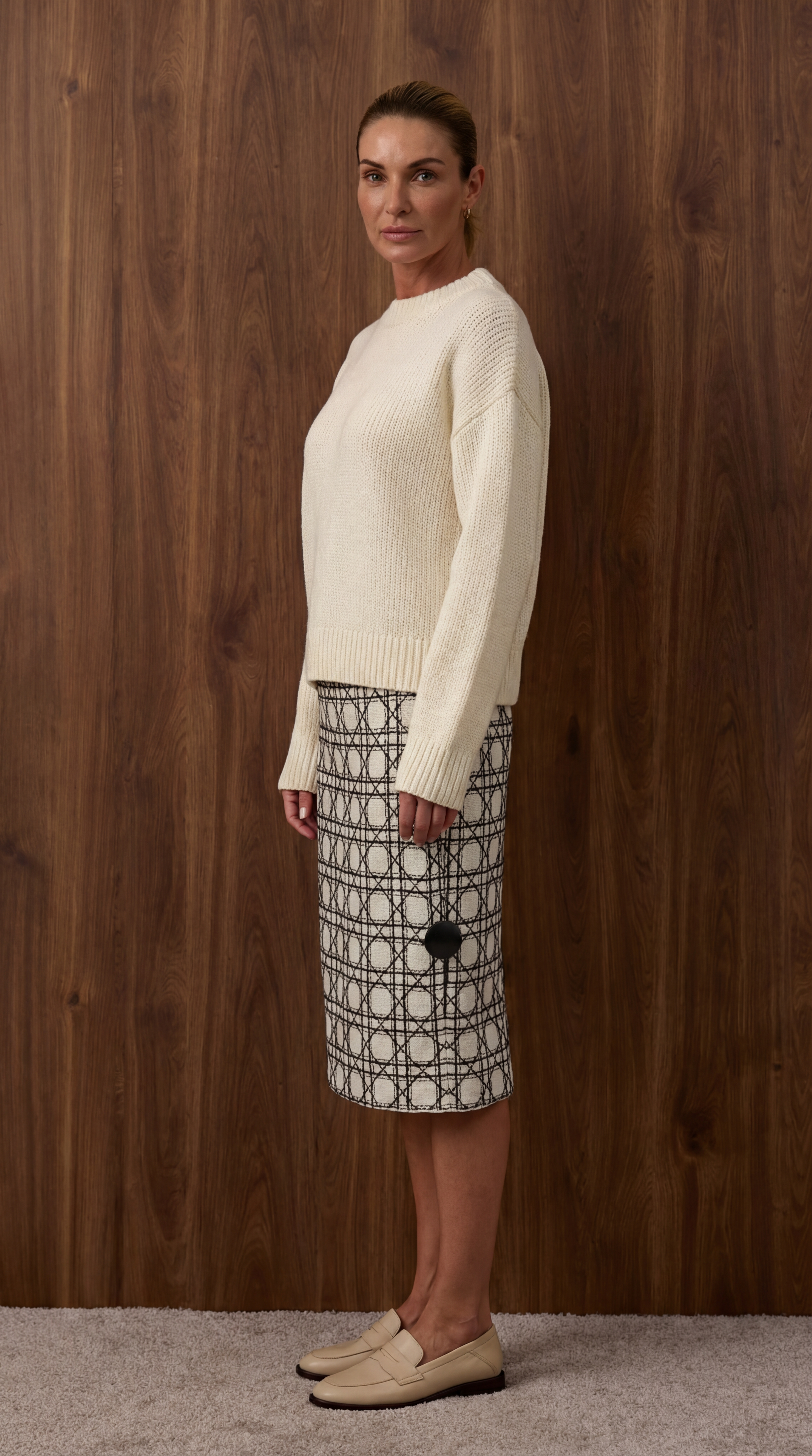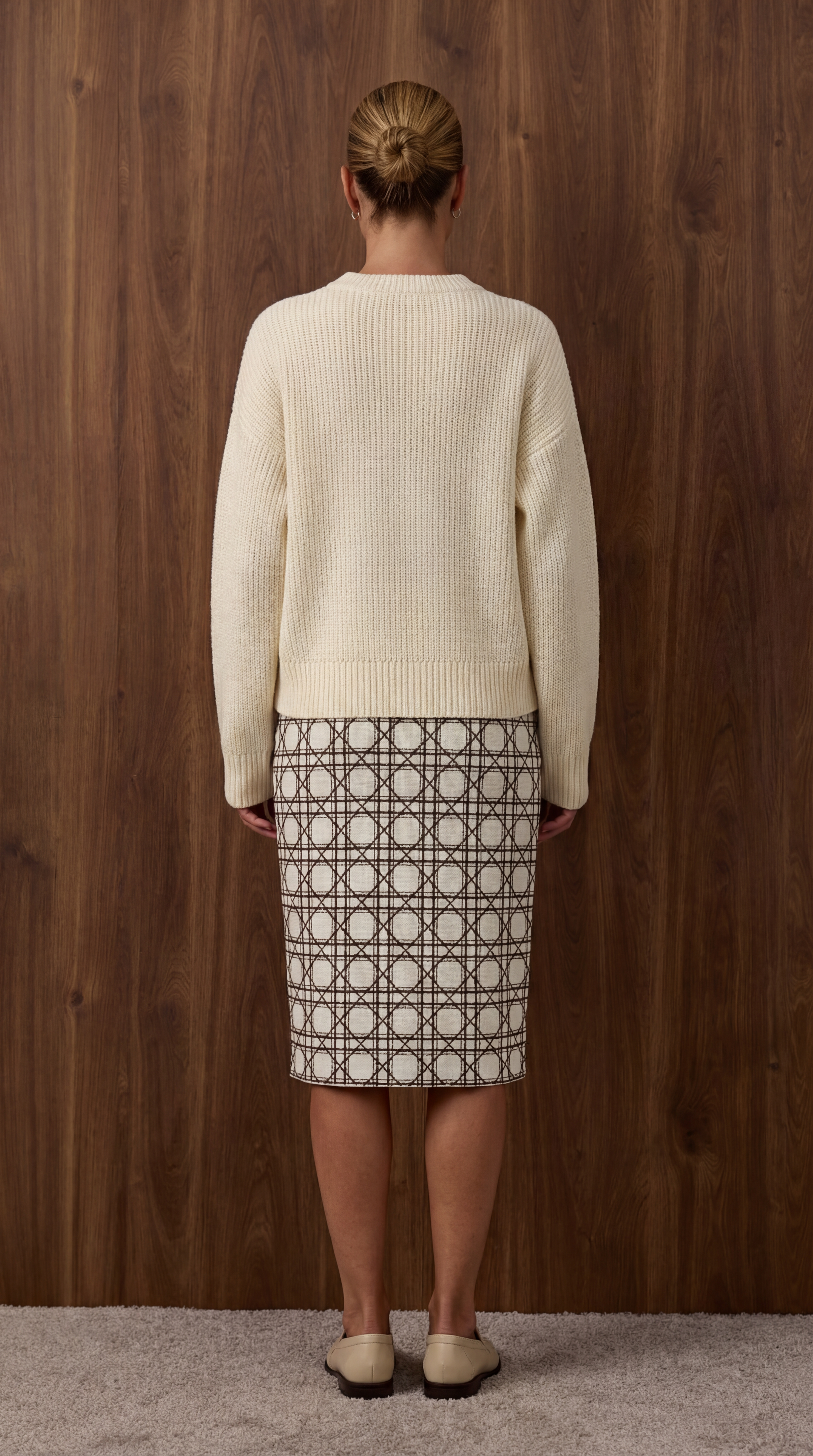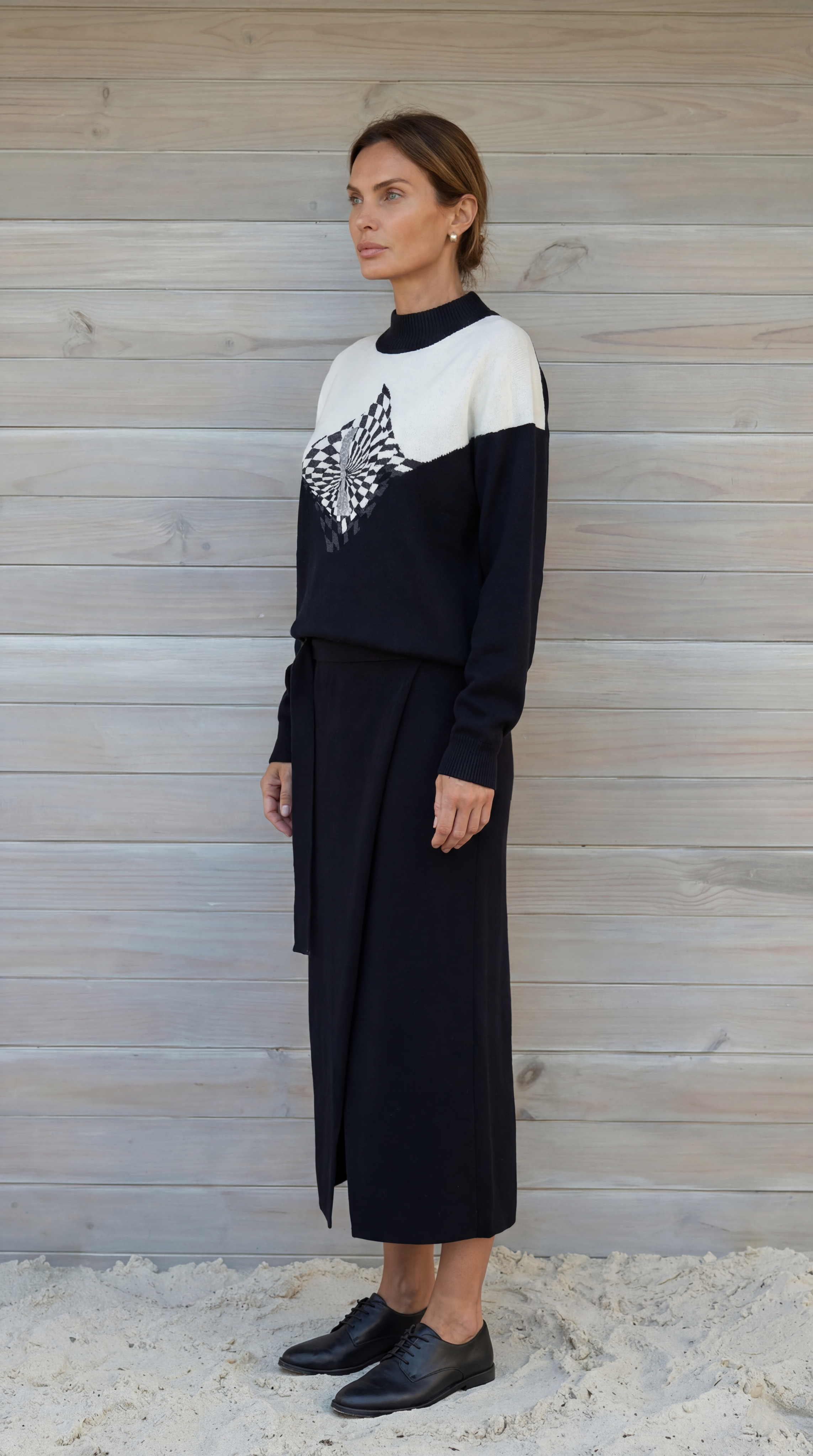 Юбка прямого кроя из плотного трикотажа с геометрическим принтом. Модель с подкладом и эластичной тесьмой на поясе.